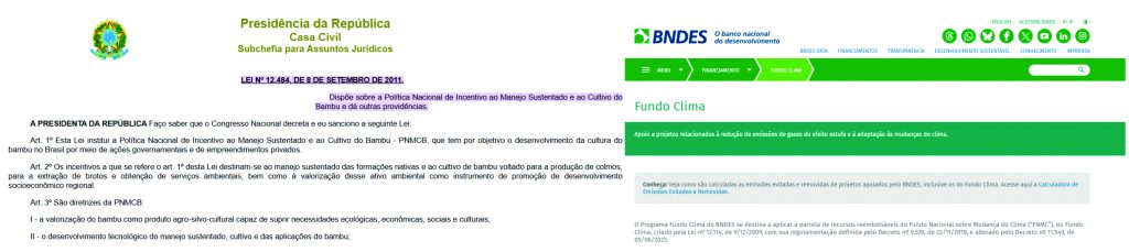 Alinhado à Lei Nº 12.484/2011, promovendo o cultivo e uso sustentável de florestas de bambu (PNMCB – POLÍTICA NACIONAL DE INCENTIVO AO MANEJO SUSTENTADO E AO CULTIVO DO BAMBU) – Linha de financiamento pelo Fundo Clima – BNDES (baixas taxas e carência).